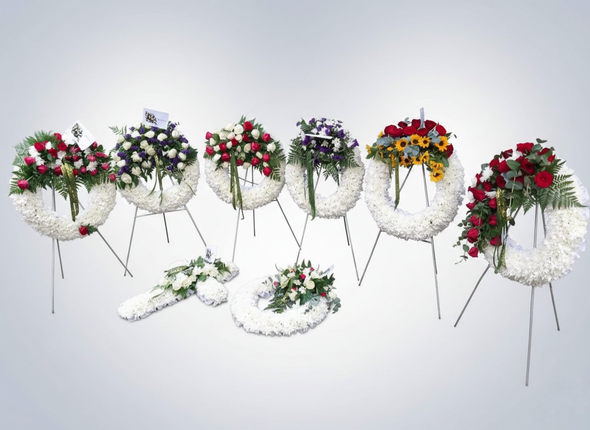 - Assorted Circular Wreaths: Multiple matching wreaths on stands to frame the viewing area or gravesite.