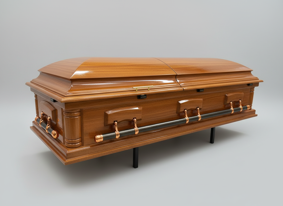 This premium casket is crafted from mahogany, a hardwood renowned for its rich reddish‑brown hue and fine grain. The deep dark‑brown finish is polished to a high gloss, accentuating the wood’s natural beauty and projecting an air of prestige. Sculpted paneling and column‑style corners create a stately silhouette, while polished bronze swing‑bar handles provide secure support and elegant contrast. Inside, the half‑couch lid opens to reveal a plush velvet interior—a hallmark of refined wood caskets—offering comfort and serenity for the final farewell. Meticulous hand‑finishing ensures lasting quality and reflects Executive Funeral Services’ commitment to dignified, culturally respectful send‑offs
