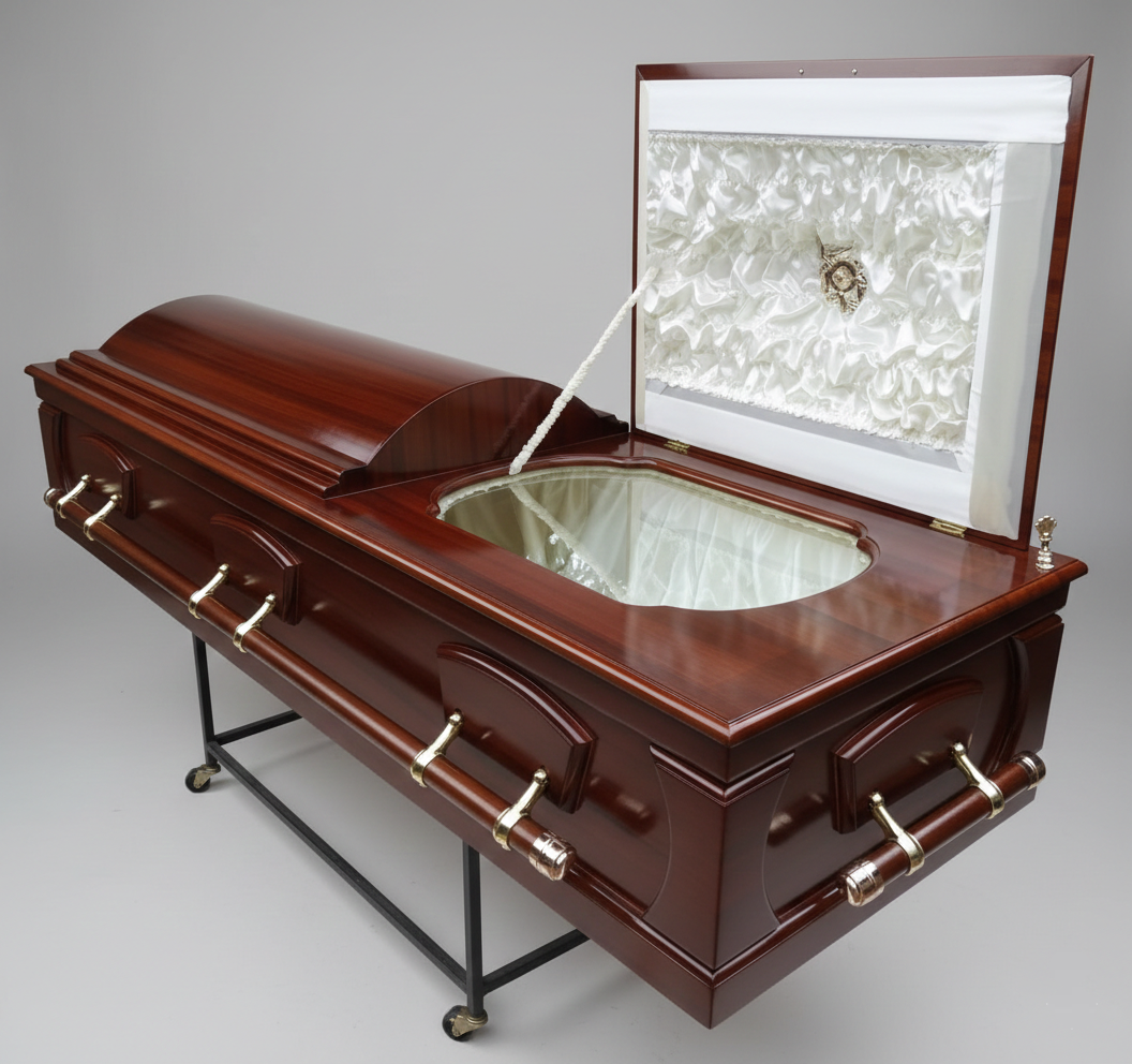 - Glass Viewport: Features a specialized half-couch opening with an integrated glass panel for protected viewing during services.