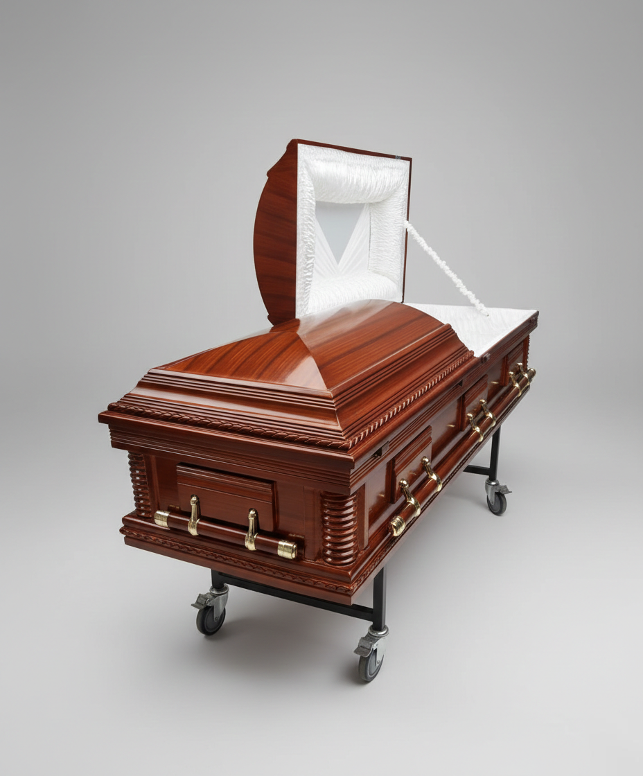 This VIP Dome casket combines traditional craftsmanship with refined styling. The gently domed lid is adorned with braided rope moulding, a design element celebrated in premium wooden caskets. Constructed from solid hardwood with a semi‑gloss brown finish, the casket features sculpted paneling and columned corners for an elegant profile. High‑end hardware includes polished brass swing‑bar handles and secure locking mechanisms. Inside, the half‑couch design can be fitted with a plush velvet or satin interior in a French‑folded style, complete with matching pillow and throw, offering comfort and sophistication for the viewing. Each casket is hand‑finished to ensure lasting quality and honours Executive Funeral Services’ commitment to dignified, culturally respectful farewells.